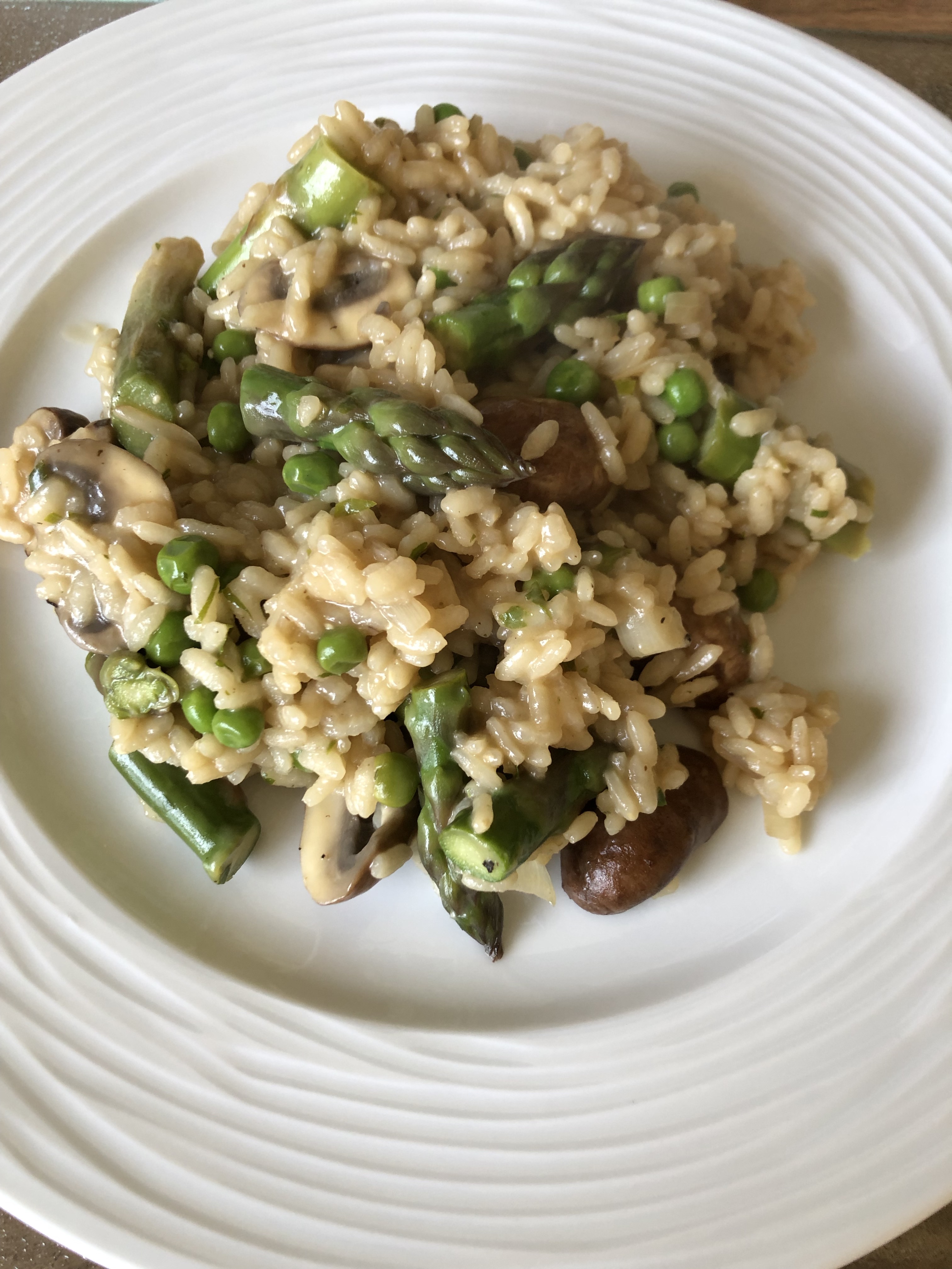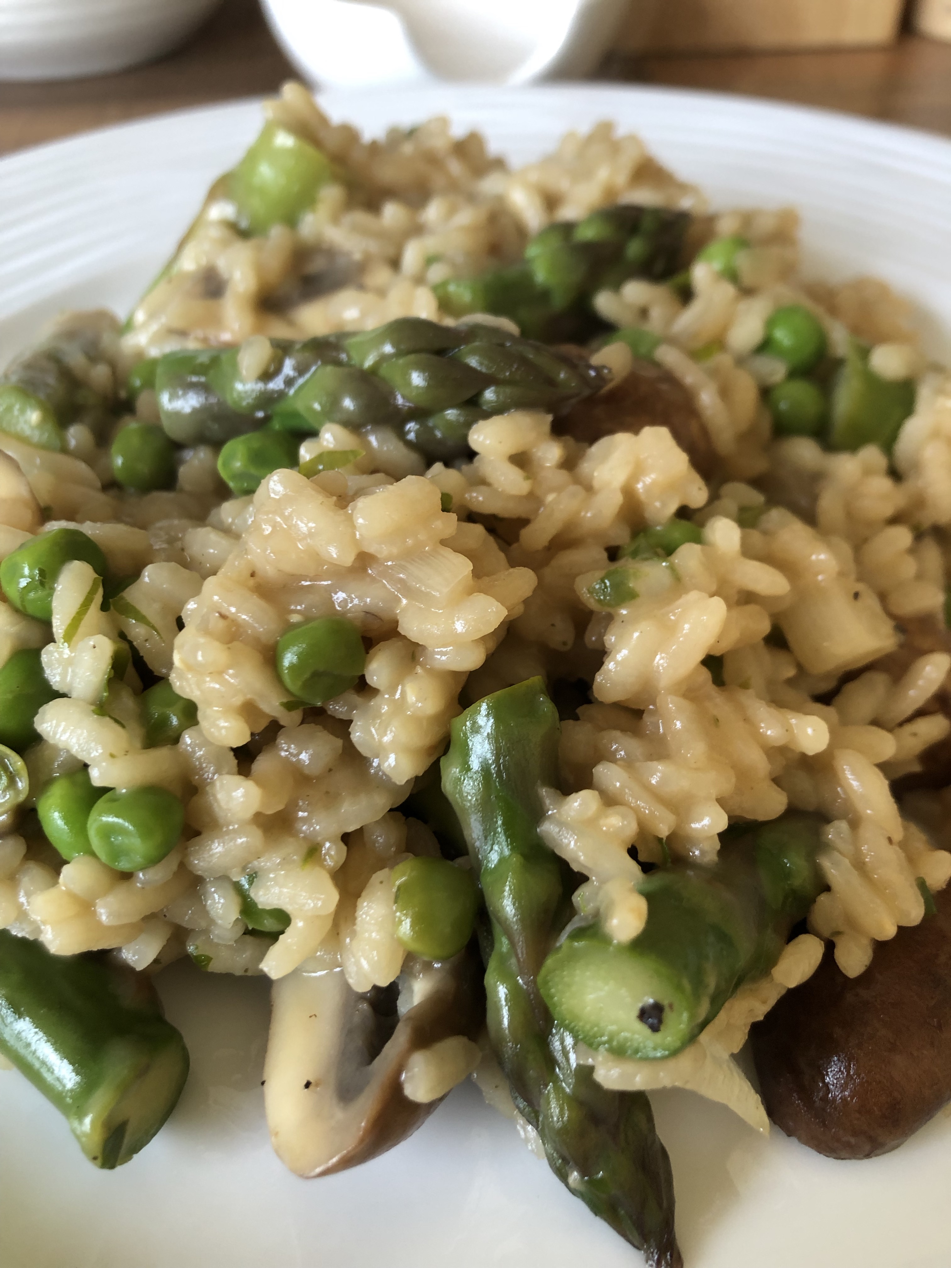 - After 10 mins add in the mushrooms, asparagus and peas whilst continuing to add the water. Cook for another 10 mins or until the rice and veg are soft but still with a bit.
